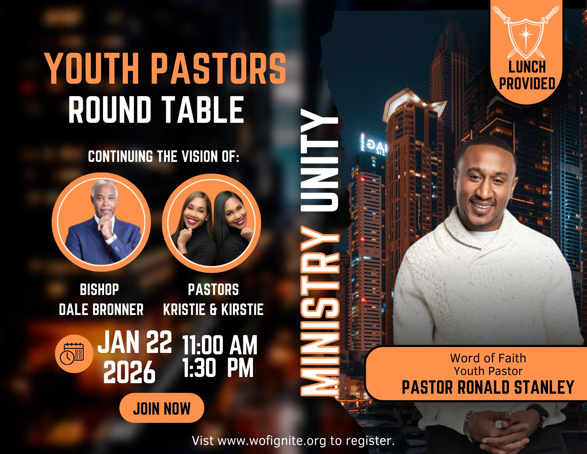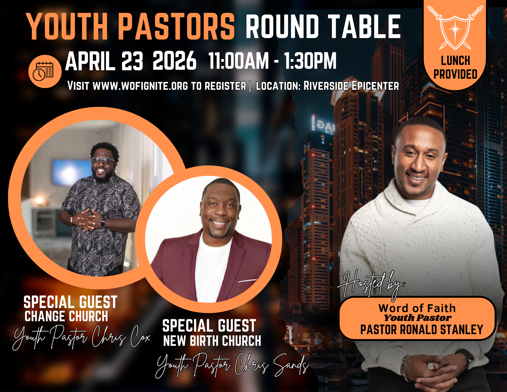 Hosted by Word of Faith Youth Pastor Ronald Stanley, the roundtable is both relational and instructional, offering an opportunity to learn from seasoned leaders while building kingdom relationships with peers. Lunch is provided, and all youth pastors and youth ministry leaders are encouraged to attend.